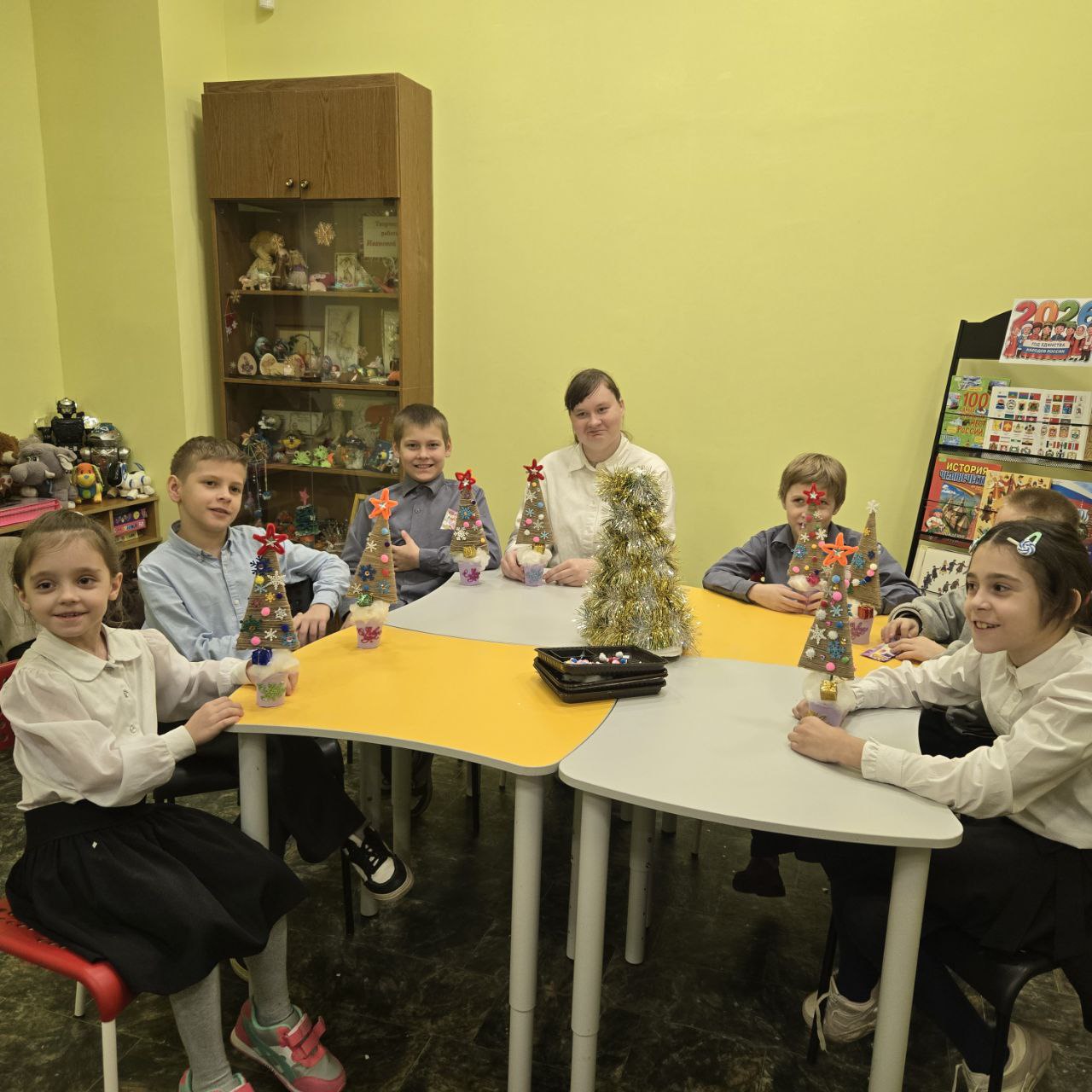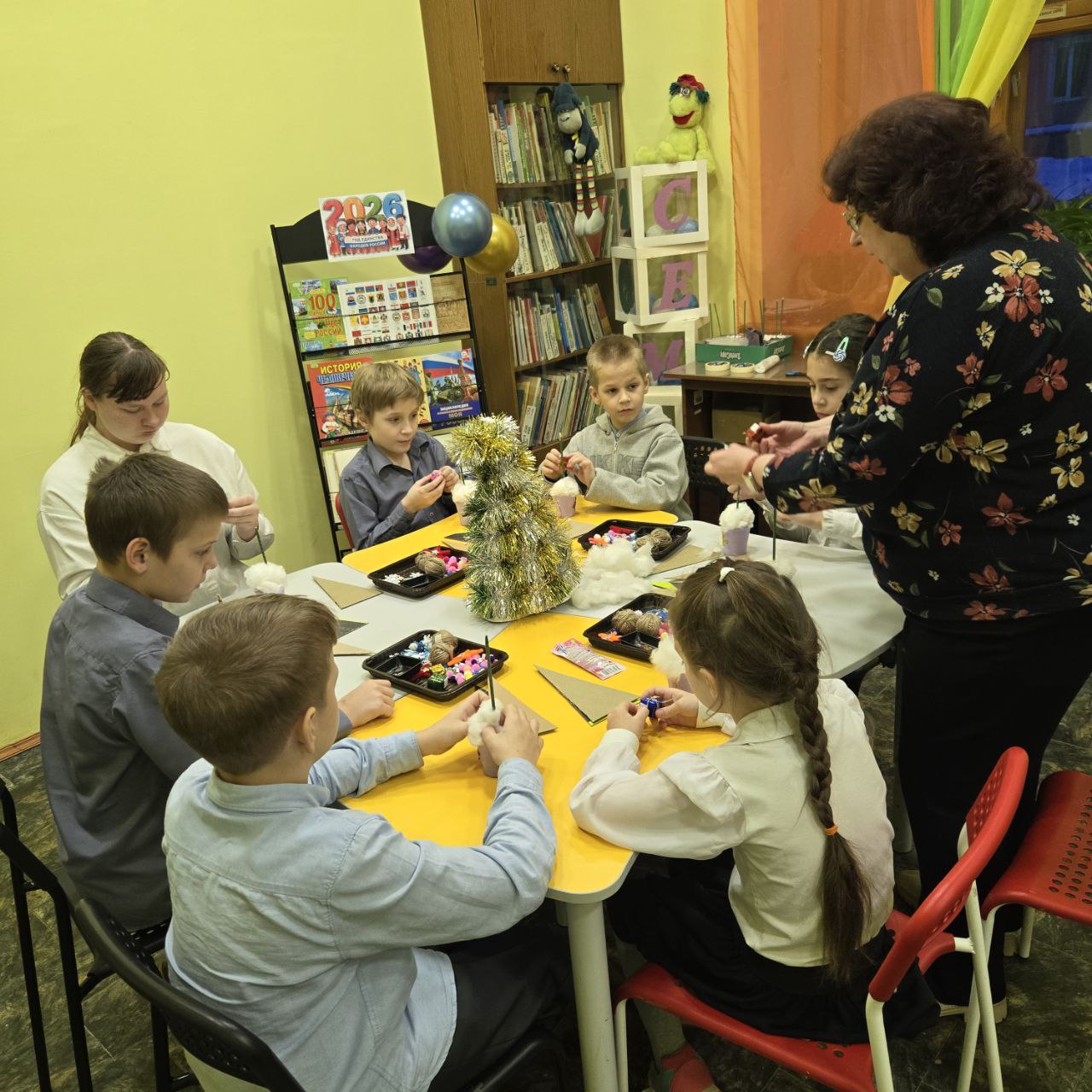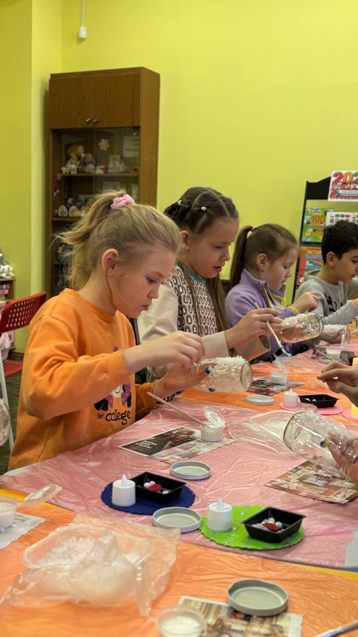 Ближе к обеду, в библиотеке собрались дети постарше. Мы вместе научились делать из простой джутовой верёвки и стаканчика для рассады новогоднюю красавицу. Звезда из синельной проволоки, снежинки из фомиарана и пушистые помпончики разукрасили ёлочку так, что даже снежок в стаканчике заискрился!