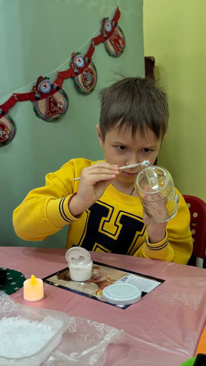За окном уже самая настоящая зима, а в воскресенье в библиотеке было очень тепло и весело. Девчонки и мальчишки, под звуки новогодних песенок, мастерили яркие подарки. Малыши познакомились с таким видом декоративно-прикладного творчества как гжель. Они научились делать в технике декупаж панно из красочных зимних салфеток. Украшенная голубыми блестками картинка зимнего домика на панно заблестела, заискрилась.