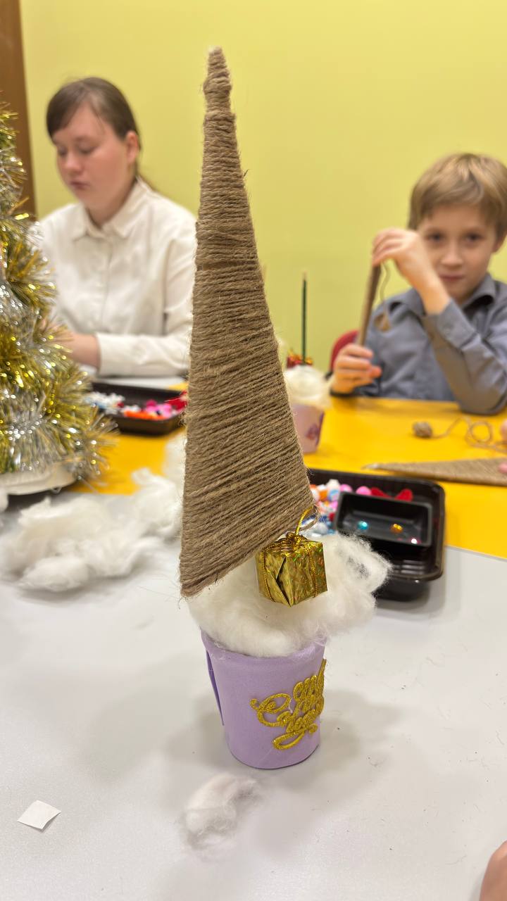 Детям очень понравился мастер-класс! Из джутовой нити, гипсовых заготовок и других декоративных материалов ребята смастерили яркие елочки-топиарии.