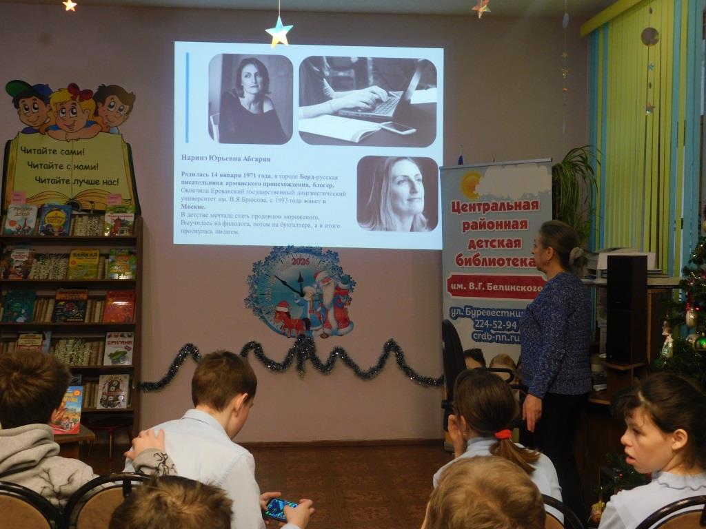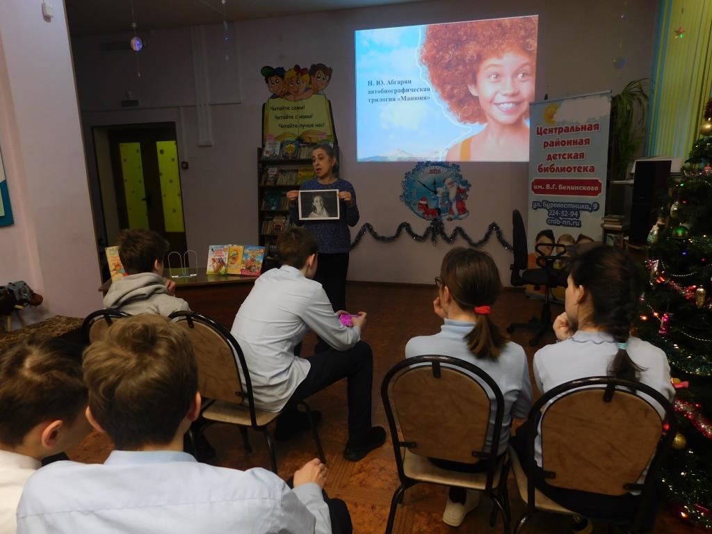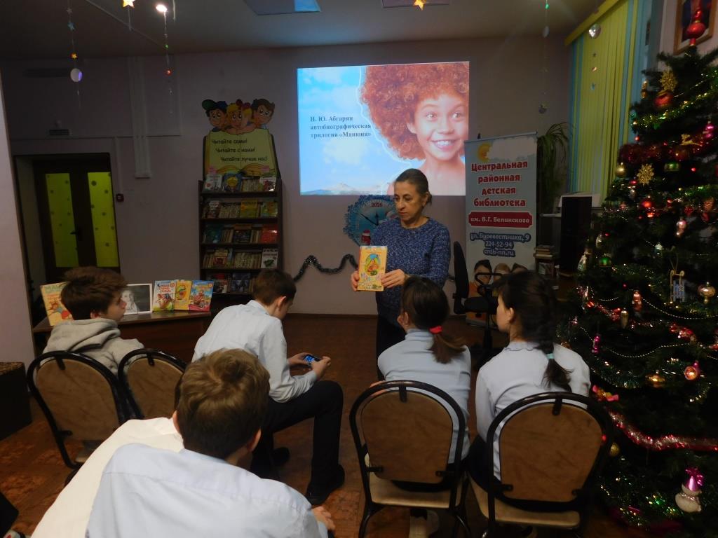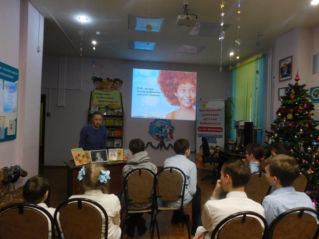 Библиотекари познакомили ребят с жизнью и творчеством писательницы, рассказали о смешной и лирической книге "Манюня", которая повествует о детстве двух девочек-подружек Наринэ и Манюни.